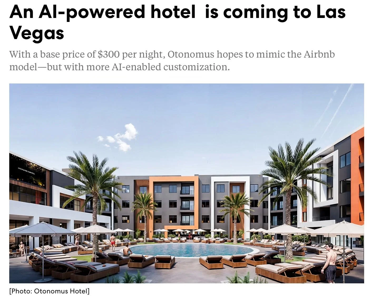 I was struck by an article in Fortune about Otonomus Hotel (pronounced ‘autonomous’) which plans to differentiate itself by leaning into AI. The project leaders believe that customers (as I’ve said for years) want a highly intelligent, highly customized experience.